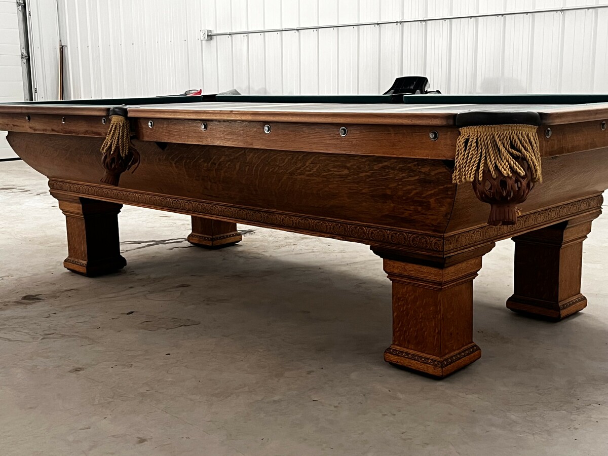 Jordan Billiards pool tables are built with only the finest solid woods or veneers, K66 canvas backed cushions, genuine leather pockets, quality Championship cloths, and only the finest diamond honed slate. We can custom stain your new Jordan Billiards pool table to almost any stain in your games room or you can choose from one of the many stains in our collection. Jordan Billiards can also move, re-cloth, refurbish, or dismantle and store your pool table if so required. All Jordan Billiards tables are built within the exacting specifications of the Billiard Congress of America, and, they’re built in Manitoba, Canada.